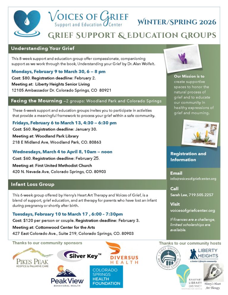 For more information or to express your interest, contact Sarah Lee, 719-505-2257, info@voicesofgriefcenter.org.